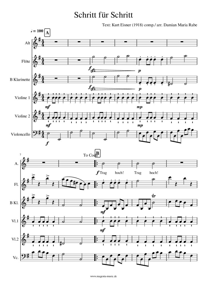 Etwa einstündiges Werk von Damian Maria Rabe mit Lyrics von Najet Adouani, Tunesien, jetzt wohnhaft Berlin. Geschrieben für: Altstimme, Flöte, zwei Klarinetten, zwei Violinen und Cello